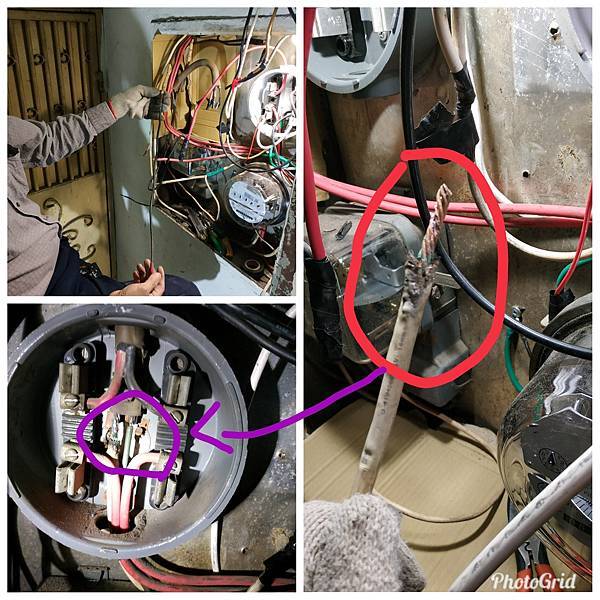 #原來是電表到室內開關箱的線路老舊燒焦跟電表底盤螺絲鏽化接觸不良造成